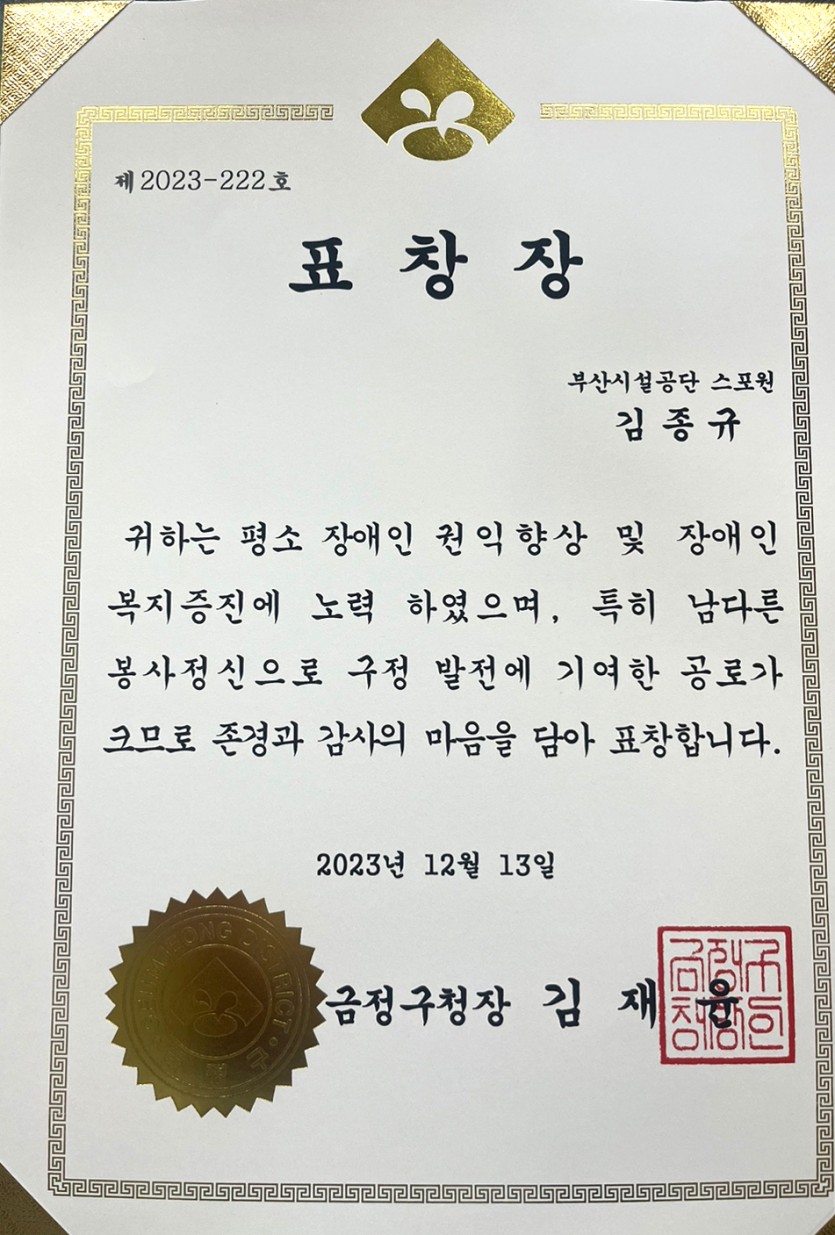 금정구청장 표창장을 수여하였습니다